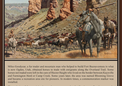 When he returned to Wyoming, he met the first wagon train of Mormon pioneers bound for Utah. When those settlers purchased Fort Buenaventura from Goodyear, he then drove them to Sacramento and sold them for a large profit to gold miners. This marks perhaps the longest horse drive in American history, spanning nearly 4,000 miles in total. In the background of the painted scene, are the Witches Rocks near the Weber River and visible from the i-84 interstate between Henefer and Echo, Utah.
