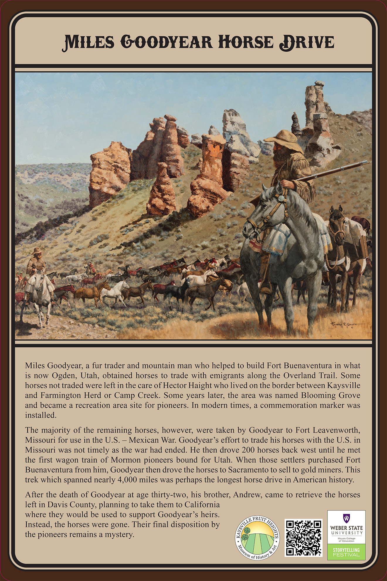 Some of the horses not traded on the trail to Oregon and California were left in the care of Hector Haight of Kaysville. The majority, however, were driven along the Overland Trail 2,000 miles to Fort Leavenworth on the Missouri River for use in the U.S. – Mexican War. The war ended before Goodyear arrived in Missouri, so he drove 200 horses back west.