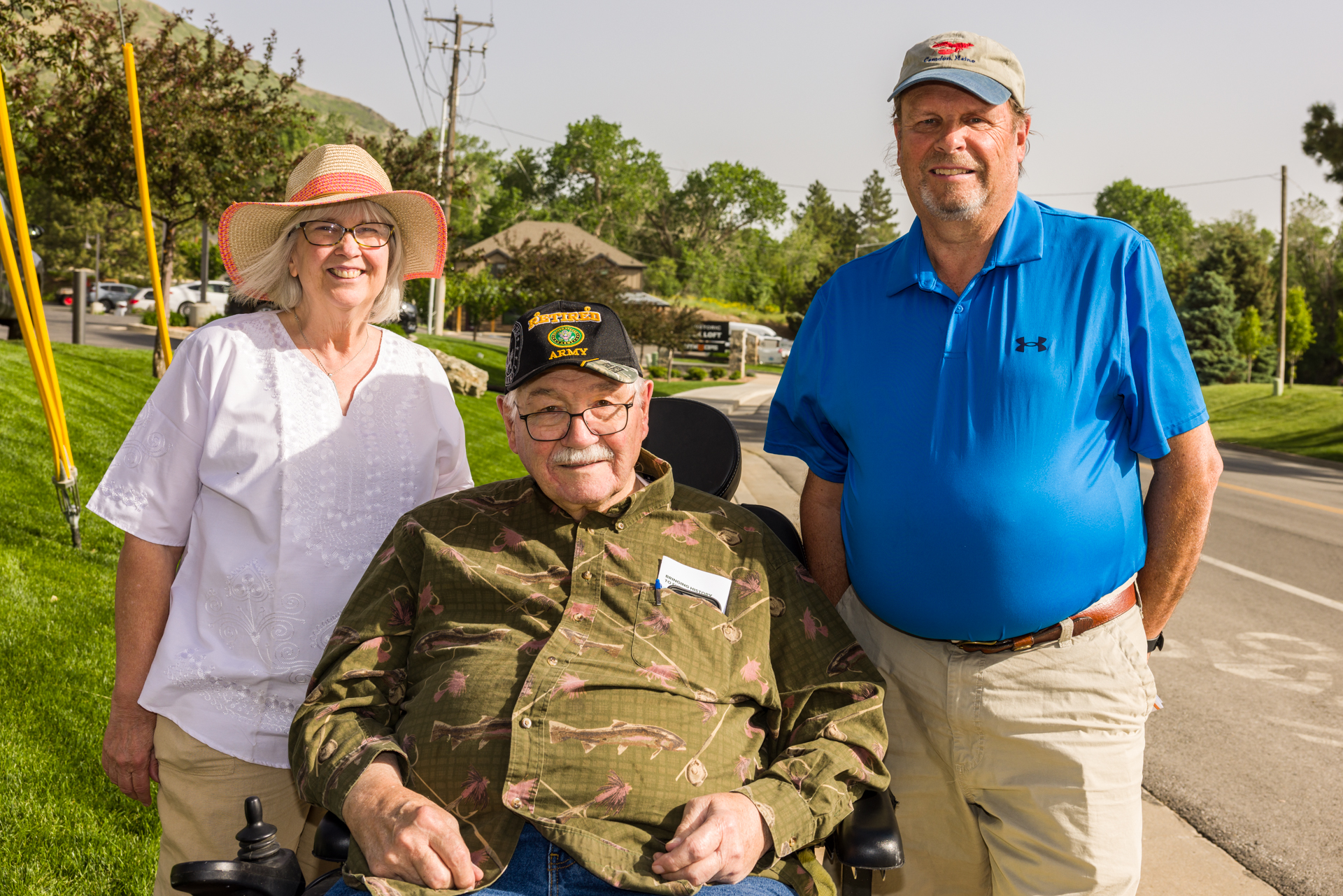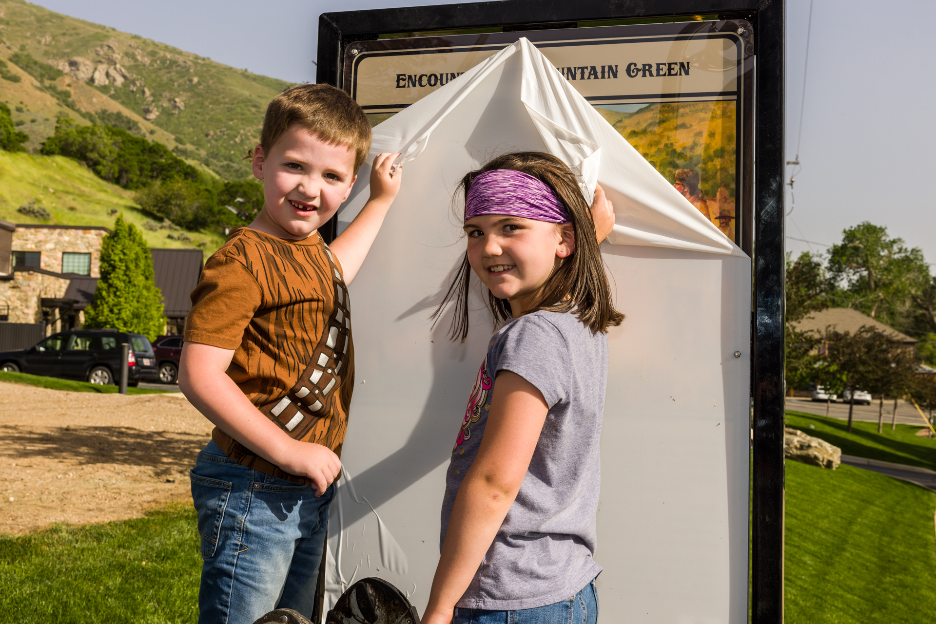 Third great-grandchildren of Grandison and Celia Raymond, pioneers to what would become Fruit Heights, pull back the covering to unveiled the signs on the marker located at the Rock Loft. Barbara Spendlove representing the Grandison and Celia Hall Raymond Family, Lynn Green representing the Robert  and Esther Adams Green Family, and Richard Harvey representing the descendants of Daniel and Hannah Harvey spoke about the contributions of these and other settlers highlighted on the historical markers. Jake and Jason Ward represented the Samuel and Ann Bunting Family.