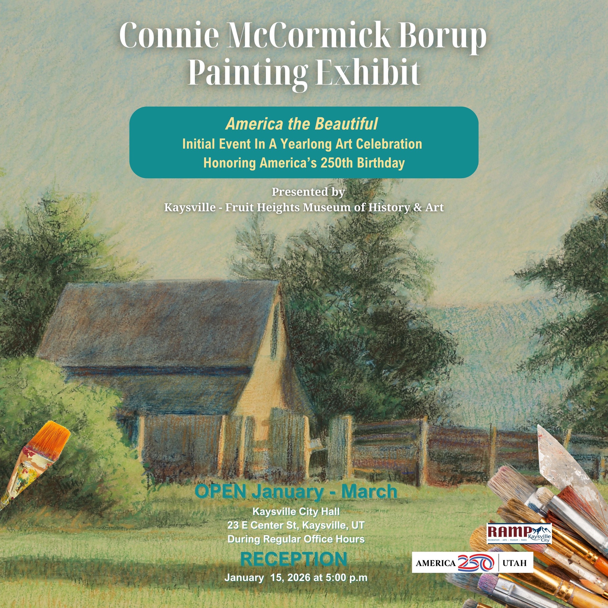 Join us at Kaysville City Hall – 23 E Center St. Kaysville, Utah for the reception to meet the artists and celebrate the beauty of America in this milestone year.